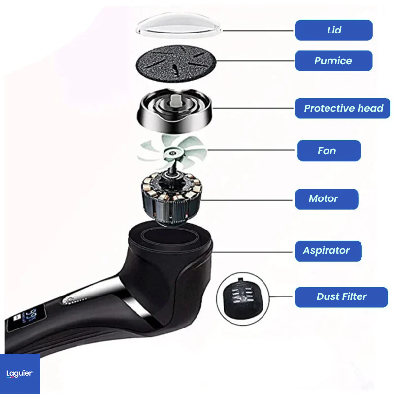 Equipped with a rotating head with abrasive micro-grains, it gently exfoliates while remaining effective on thicker areas. Its ergonomic design and adjustable speeds ensure easy handling and comfortable use, even during extended treatments.